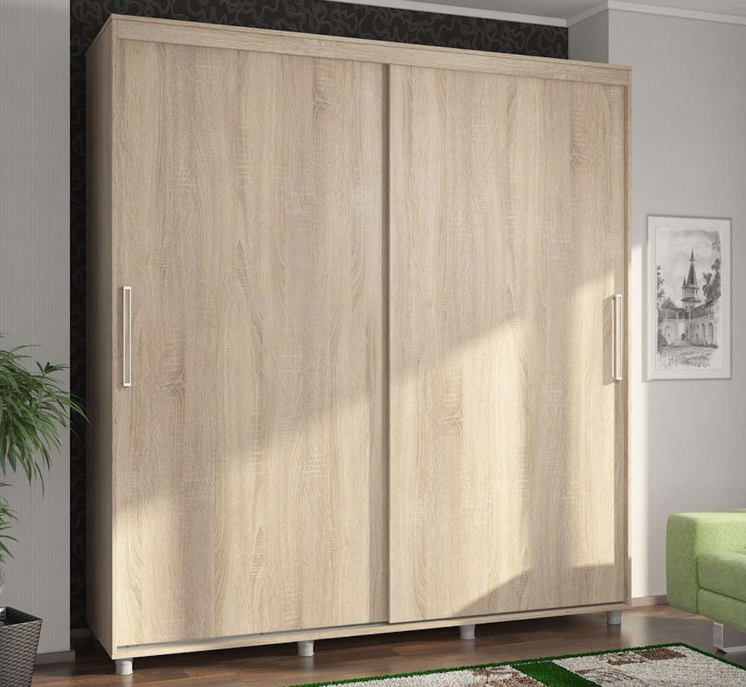 Особенности шкафа-купе: Современный стиль, экологичные материалы, надежная и удобная в использовании фурнитура. Торцы деталей обработаны кромкой ПВХ 0,4 мм. в цвет ЛДСП. Ручка – пластиковая скоба прямоугольная, цвет матовый металлик, вставка в цвет каркаса. Габариты (ШхВхГ): 25х330х25 мм. Выдвижные ящики оснащены роликовыми направляющими длиной 400 мм. Раздвижная система изготовлена из алюминиевого профиля. Легкое перемещение дверей и плавность хода обеспечивается за счет надежных нижних роликов, оснащенных шариковыми подшипниками. Верхние ролики исключают возможность соскальзывания дверей во время эксплуатации. Регулировка зазоров и положения дверей производится с помощью регулировочных винтов на нижних роликах. Для фиксации створок в закрытом положении используется металлический стопор, который фиксируется в направляющих. Щётка-шлегель, приклеенная на торец створок, обеспечивает их бесшумное закрывание и защищает вещи от пыли. Регулируемые опоры высотой 60 мм., позволяют устанавливать шкафо вплотную к стене, не затрагивая напольный плинтус. Сборка изделия является универсальной, расположение секции со штангой возможно как с правой, так и с левой стороны.